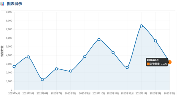 2026年3月未发生重大网络信息安全事件,网络信息安全态势总体正常。月威胁告警数量统计趋势如下图所示: