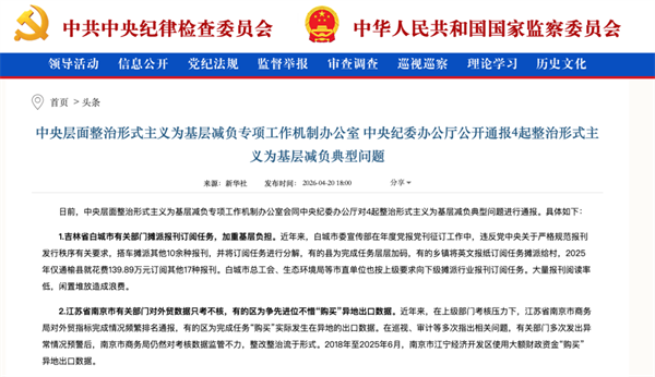 再看另一则通报——中央层面整治形式主义为基层减负专项工作机制办公室、中央纪委办公厅公开通报4起整治形式主义为基层减负典型问题。