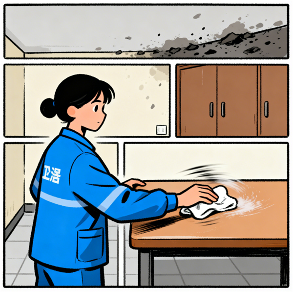 不良保洁员追求速度而非质量,敷衍完成任务,导致很多卫生死角得不到清理,钱花了却没得到彻底清洁。